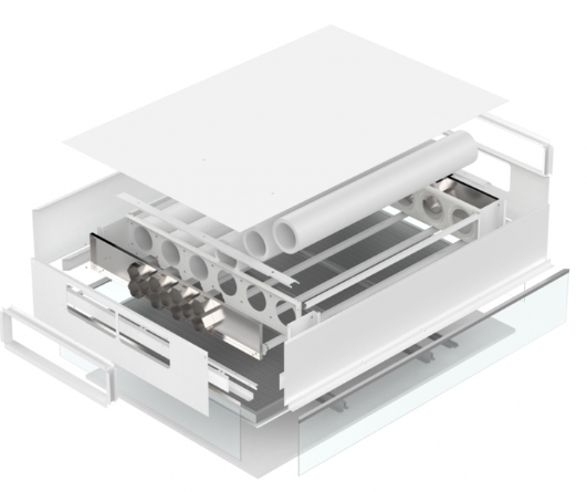 Ламинарный потолок встраивается в приточный канал вентиляции, обеспечивая стерильность и ламинарность подаваемого воздушного потока над рабочей зоной. Площадь ламинарного поля – 2,16 м кв.